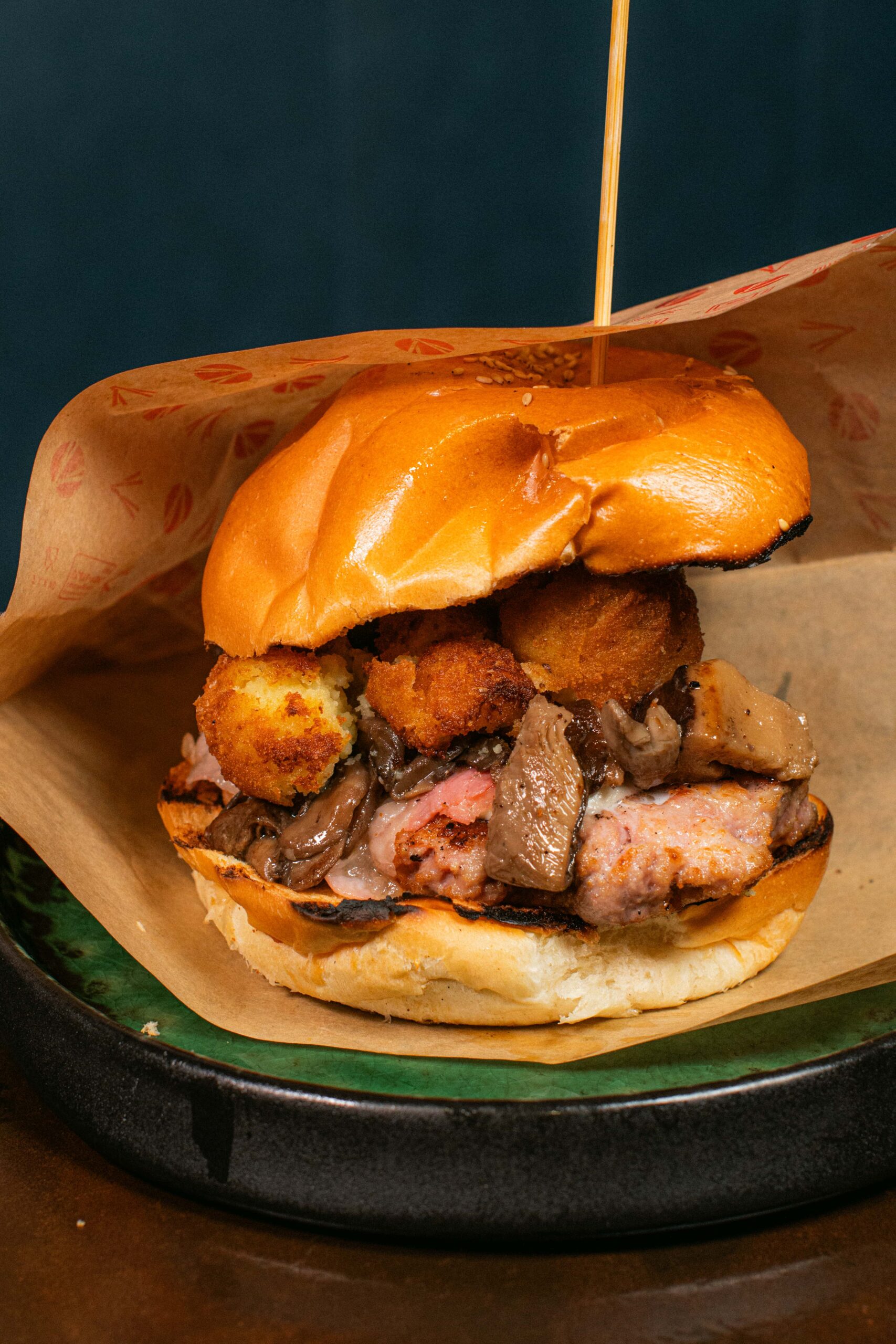 BURGER DI SCOTTONA, CHEDDAR, BACON, CROCCHÈ DI PATATE E FONDUTA DI CACIOCAVALLO